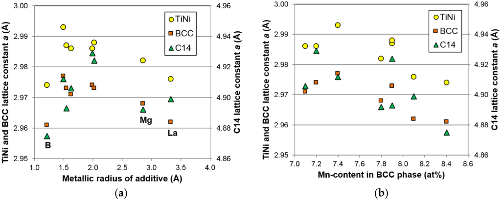 Plots of the lattice constants a for the TiNi, BCC, and C14 phases vs. (a) the metallic radius of the additives and (b) the Mn-content in the BCC phase.