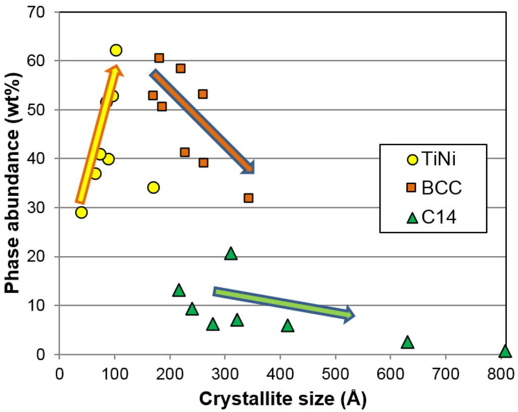 Plots of abundances vs. crystallite size for the TiNi, BCC, and C14 phases.