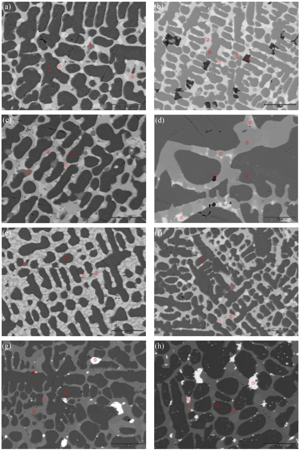 Scanning electron microscope SEM backscattering images from alloys (a) P17; (b) P38; (c) P39; (d) P40; (e) P41; (f) P42; (g) P43; and (h) P44. The scale bar at the lower right corner represents 25 μm.