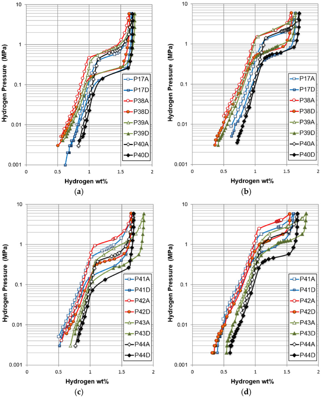 Pressure-concentration-temperature (PCT) isotherms measured at (a) 30 °C and (b) 60 °C for alloys P17, P38, P39, and P40; and (c) 30 °C and (d) 60 °C for alloys P41, P42, P43, and P44.