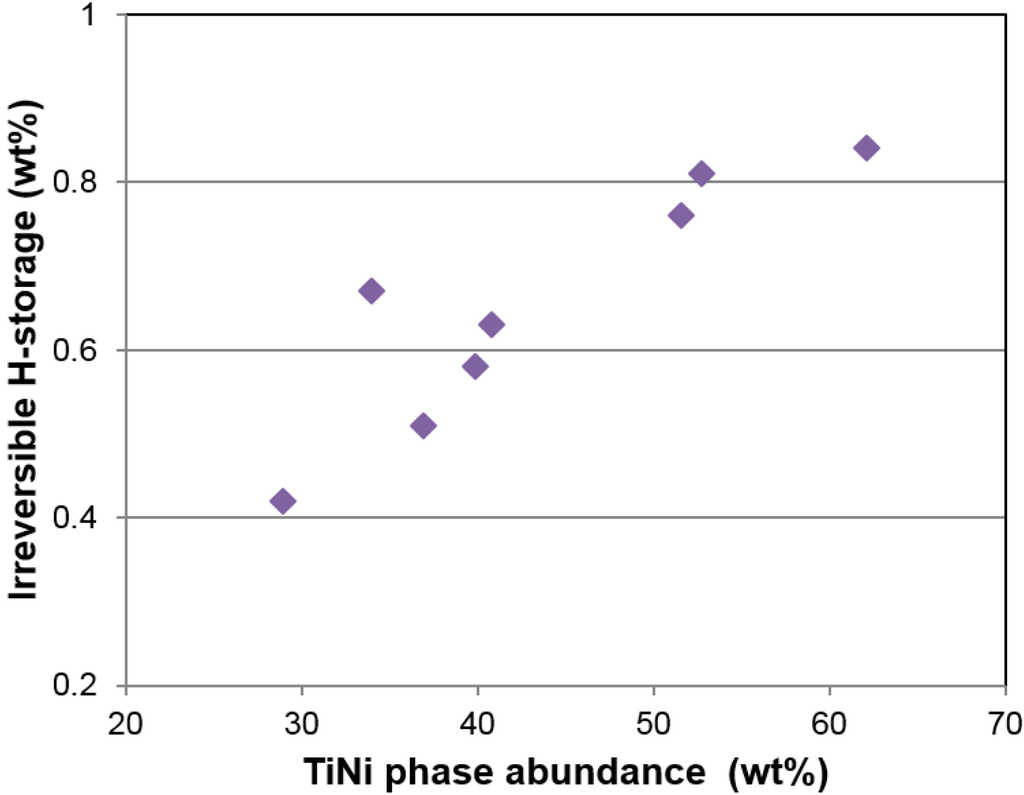 Plot of the amount of irreversible hydrogen storage found in PCT analysis vs. the TiNi phase abundance.
