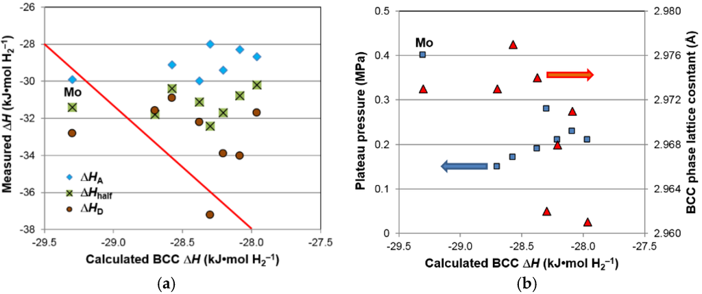 (a) The measured ∆H based on the absorption, half-point, and desorption isotherms and (b) Plateau pressure and BCC phase lattice constants vs. the calculated ∆H based on BCC composition determined by EDS (Table 4) and Equation (3).