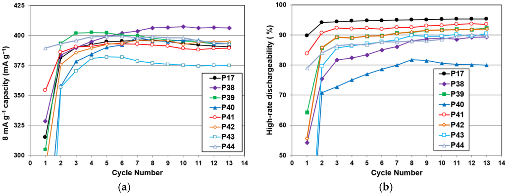 The electrochemical hydrogen storage properties were determined in a flooded half-cell configuration with a commercially available co-precipitated Ni91Co4.5Zn4.5 hydroxide (BASF, Rochester Hills, MI, USA) counter electrode and 30 wt % KOH electrolyte. The pressed electrode was charged with a current density of 100 mA·g−1 for 5 h and then discharged with the same current density to a cut-off voltage of 0.9 V with two more pulls at 24 mA·g−1 and 8 mA·g−1 at the same cut-off voltage. The obtained total capacities and HRDs (as defined by the ratio between capacities obtained from 100 mA·g−1 and the total discharge capacity) from the first 13 cycles are plotted in Figure 8a,b, respectively, to demonstrate the activation behavior of these alloys. Most of the alloys reach their maximum capacity at Cycle 3 or 4, except for alloys P38 (B) and P40 (Y) which require more cycles to stabilize the capacity. It is easier to achieve HRD activation for alloys with higher HRD than those with lower HRD (alloys P40, P38, and P43). The capacities from 100 mA·g−1 and 8 mA·g−1 discharge currents and their ratios for Cycle 5 are listed in Table 7. It is obvious that while the increase in the full capacity is only marginal with B (P38) and Nd (P44), the decrease in high-rate capacity and HRD is significant. The additives chosen for this study do not significantly improve the electrochemical properties of the base alloy (P17). The gaseous phase capacity is converted to the electrochemical capacity following 1 wt% H2 = 268 mAh g−1 and plotted in Figure 9. As in other MH alloys [53], both the low-rate and high-rate electrochemical capacities fall in between the boundaries set by the maximum and reversible gaseous phase capacities. There is no clear correlation between the gaseous phase maximum storage capacity and the electrochemical low-rate capacity, but there is a strong similarity between the gaseous phase reversible capacity and the electrochemical high-rate capacity, except for the base alloy P17 (V).