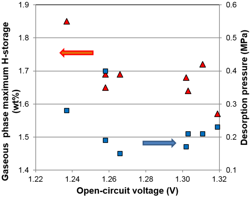 The plots of gaseous phase maximum hydrogen storage capacity and equilibrium plateau pressure from PCT desorption isotherm vs. the OCV obtained from the half-cell measurement.
