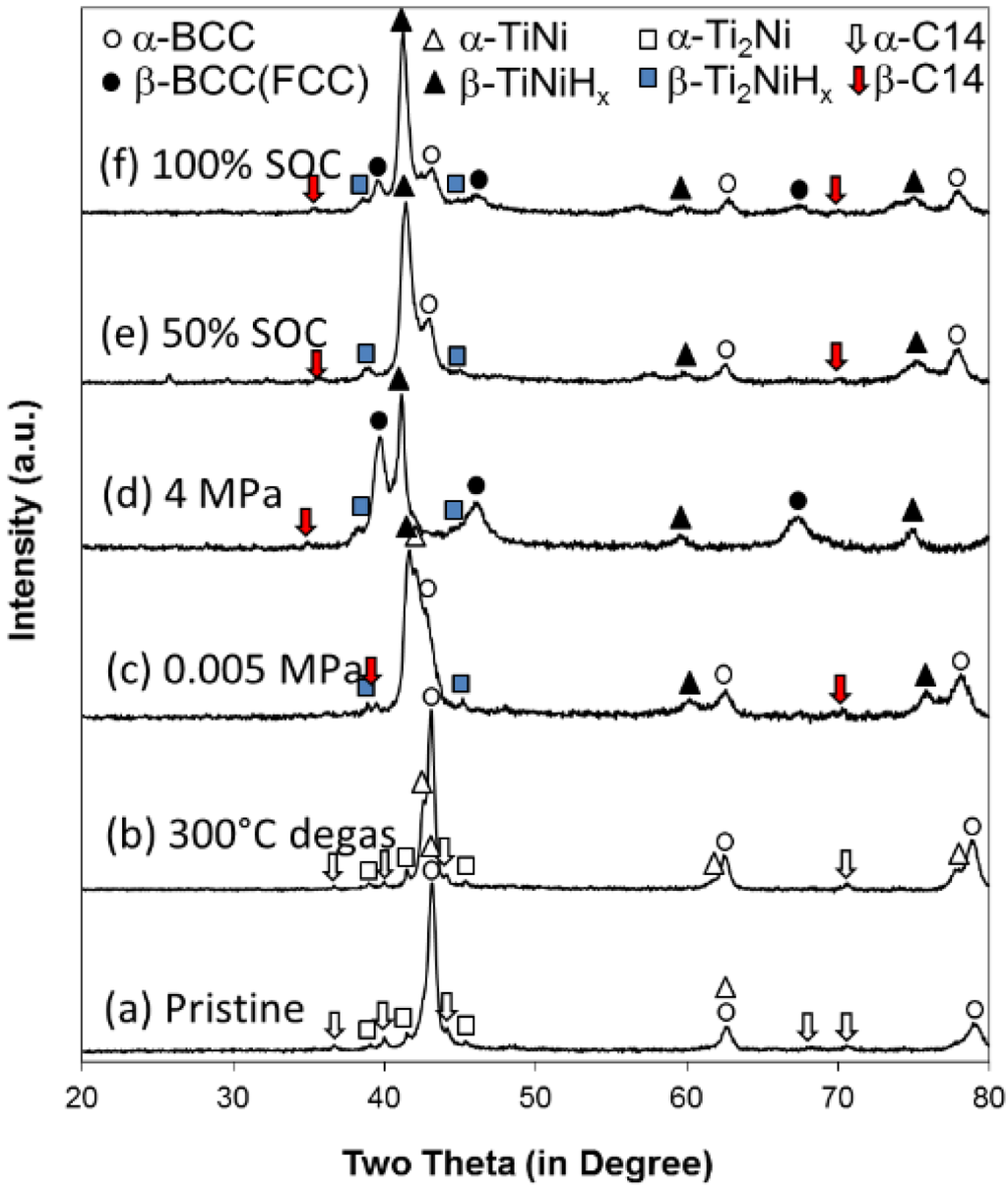 Besides the phase transition in the gaseous phase hydrogen reaction, we also performed XRD analysis on two pieces of electrode made from the same P17 alloy by induction melting with 50% and 100% state of charge (SOC). The resulting patterns are shown in Figure 11e,f. The Rietveld analysis shows a clear α-BCC phase and almost fully hydrided TiNi, Ti2Ni, and C14 phases for the 50% SOC sample, while a 40% hydrided BCC (β-BCC) phase with the other phases fully hydrided are seen for the 100% SOC. During charging, the phases with stronger MH bond strength (more negative ∆H) were hydrided first, and BCC was charged last, as in the case of the gaseous phase reaction. The BCC phase was not hydrogenated before completion of hydride formation in other non-BCC phases. The BCC phase was never fully charged in the half-cell testing, due to the nature of the open-to-air configuration used in the electrochemical study. This explains the low electrochemical discharge capacity found in Figure 9, when compared to the gaseous phase maximum capacity.