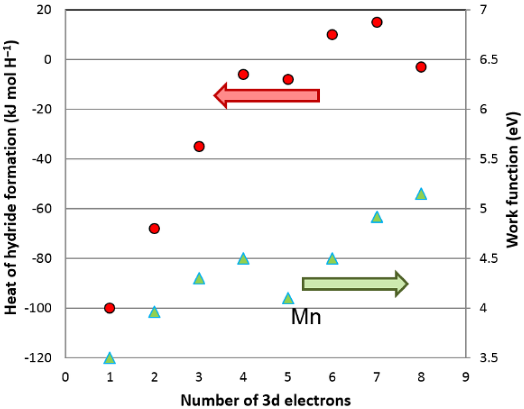 A plot of the heat of hydride formation (data from [52]) and work function (data from [60]) vs. the number of 3d electrons for the first row of transition metal elements from Sc to Ni.