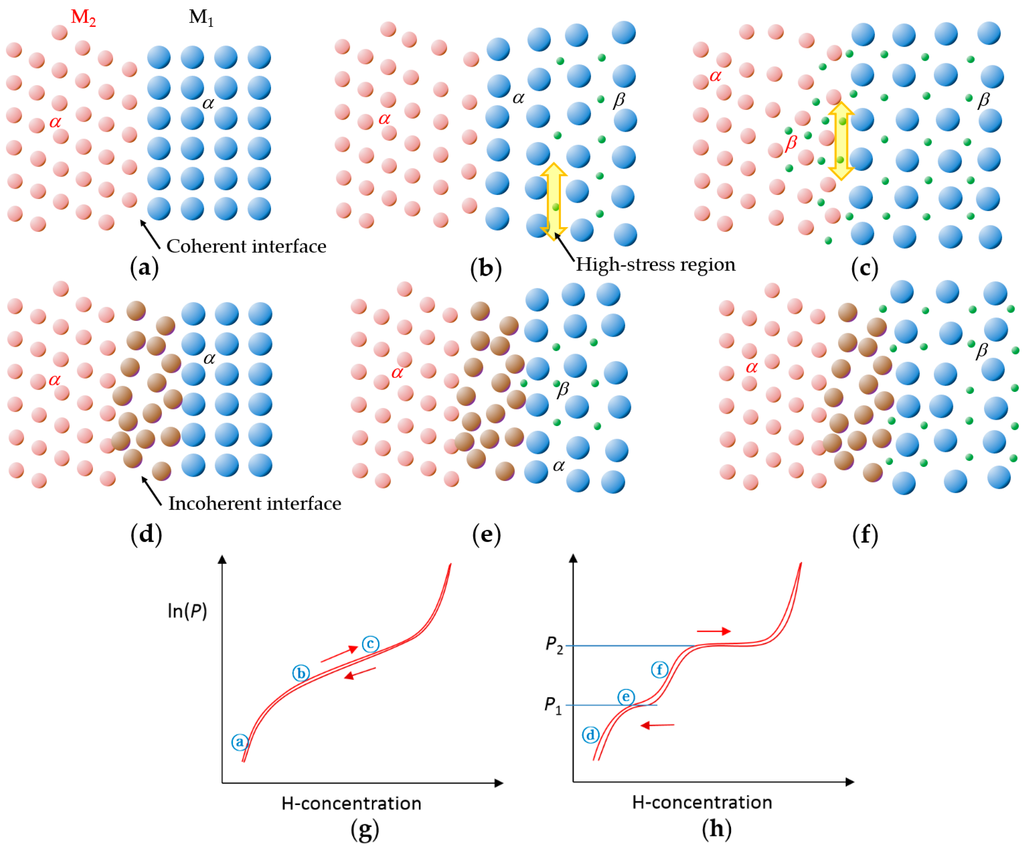 Schematic diagrams showing a coherent interface between the M1 (blue balls) and M2 (red balls) phases at the stages of (a) no hydrogen; (b) M1 partially hydrided and the metal (α)–metal hydride (MH, β) phase boundary carrying the high-stress; and (c) M1 completely hydrided and the M2 lattice expanded due to the stress from the M1 side, which facilitates the entrance of hydrogen (green dot) to enter the M2 side, an incoherent interface at the stage of (d) no hydrogen; (e) M1 with mixed α and β phases; and (f) M1 in the β phase and M2 in the α phase, and pressure-concentration-temperature (PCT) isotherms corresponding to a multi-phase MH alloy with (g) a coherent interface (a–c) and (h) an incoherent interface (d–f). P1 and P2 are the equilibrium pressures for the M1 and M2 phases, respectively. Forward and backward arrows represent absorption and desorption isotherms, respectively. While (g) PCT isotherm can be found in most of the AB2 multi-phase MH alloys with strong synergetic effects from secondary phases ([26], for instance), (h) isotherm can be found in a discrete system such as Mg2Ni and Ni mixture [27].