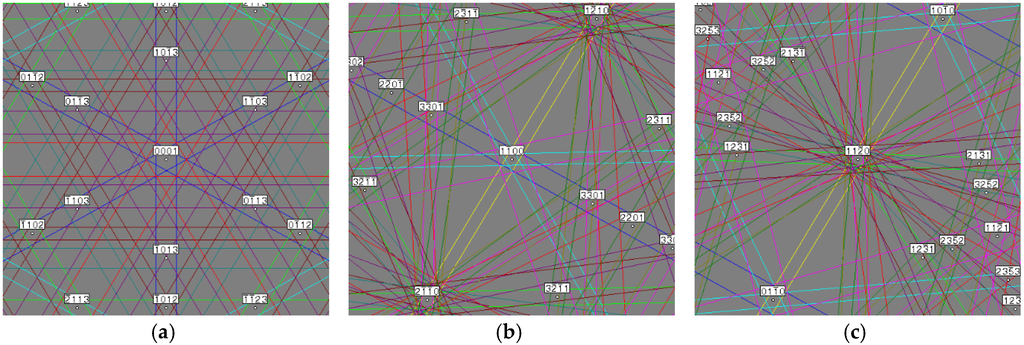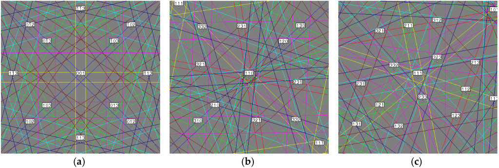 Computer generated EBSD patterns for: (a) (001); (b) (110); and (c) (111) surfaces of a C15 (cubic) crystal structure.