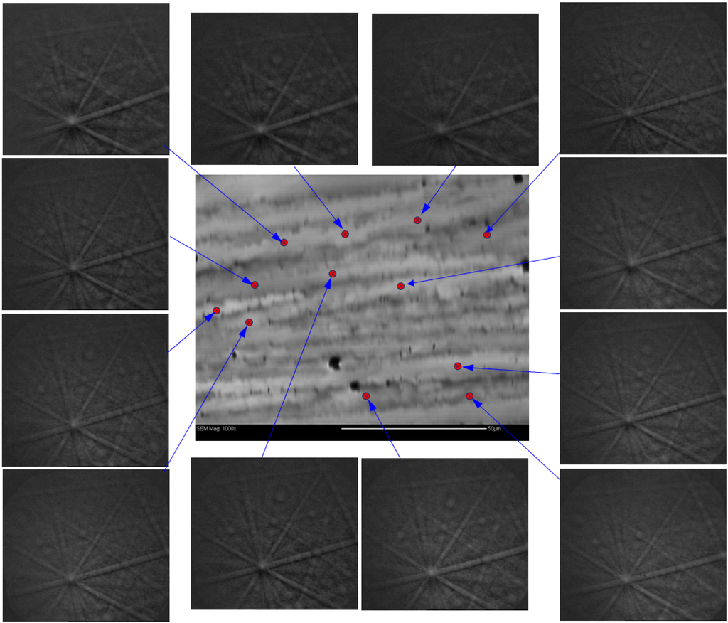 EBSD patterns of 12 different spots on a ZN06 alloy sample showing the crystallographic orientations of all the studied Zr7Ni10 grains are well aligned.