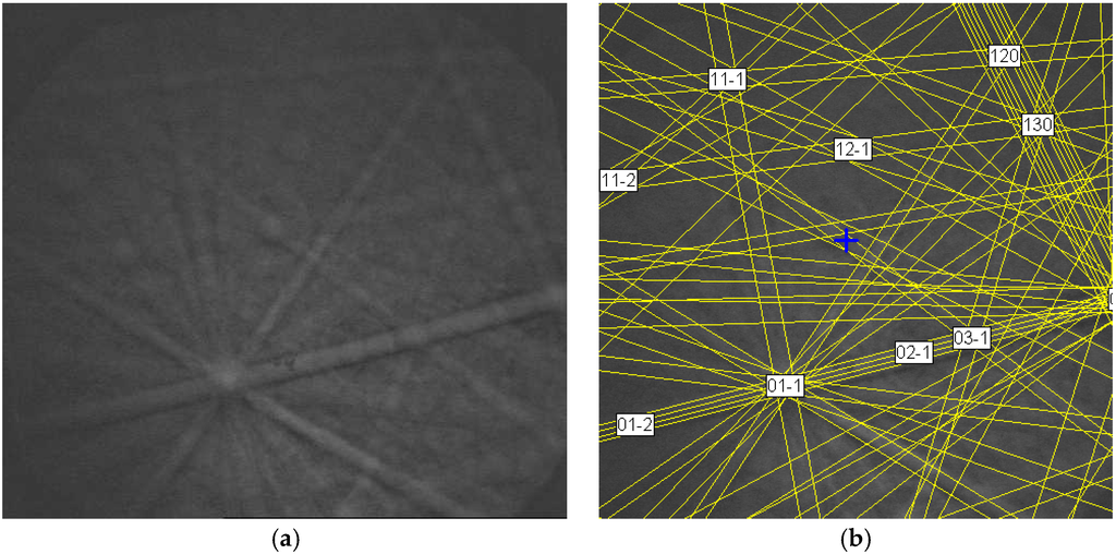 (a) A typical EBSD pattern; and (b) a computer generated index from a Zr7Ni10 phase.