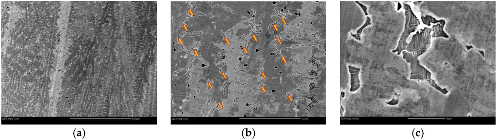 SEM-BSE micrographs from Alloy #2 at different magnifications. The scale bars represent: (a) 500 μm; (b) 100 μm; and (c) 10 μm.