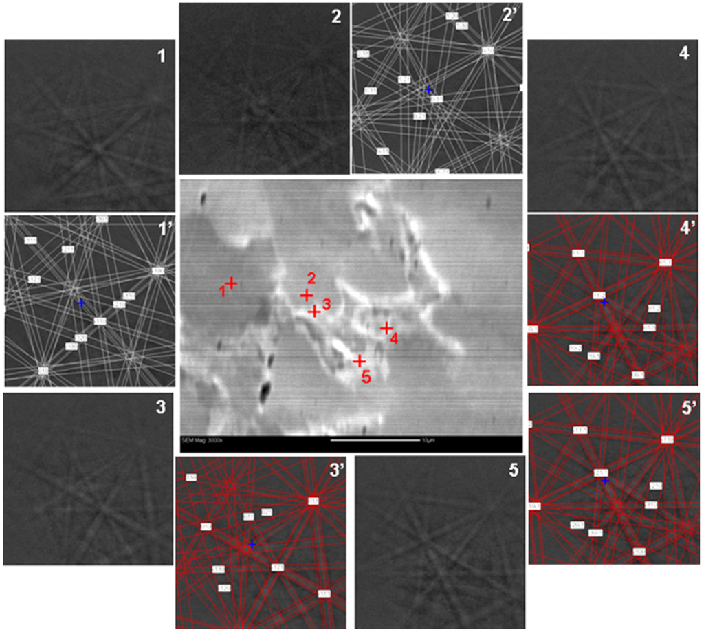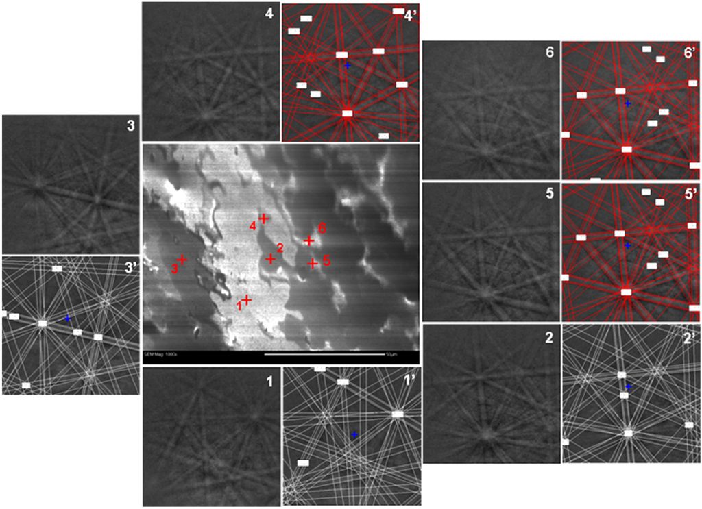EBSD patterns at 10 different spots on a ZN06 alloy sample with three major crystallographic orientations (A, B, and C) and one minor crystallographic orientation with a small angle grain boundary (A’) present in Zr7Ni10 grains.