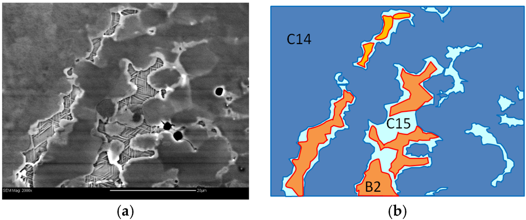 A compromise was made between high probe current mode and high resolution mode in the SEM experiments. In order to obtain high quality EBSD patterns, the SEM was adjusted to a high probe current mode, sacrificing resolution of the image, and thus the image shown in Figure 10 is not very clear. However, compared with Figure 11, it is apparent that the C15 Laves phase usually exists near the needle-like areas.