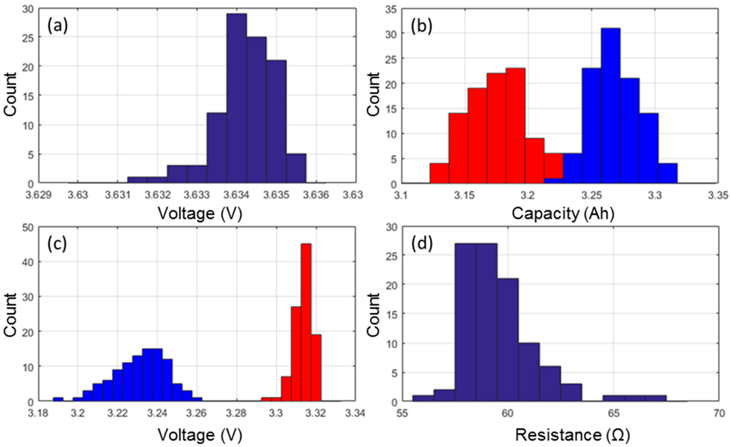 Looking at the capacity retentions, the cells delivered on average 3.269 Ah when subjected to a C/5 rate and 3.177 Ah when subjected to a C/2 rate. The standard deviation of the C/2 discharges was slightly higher (0.8% versus 0.6%) than it was for the C/5 discharges. Both capacity distributions were close to normal but with two outliers with higher capacities (Figure 1b). The next parameters to investigate were the RCV at the beginning and at the end of both discharge regimes. Since the cells were charged with the same protocol prior to the C/5 and the C/2 discharges, the RCV at BOD were similar for both discharge regimes, 4.174 V on average with a 0.04% standard deviation. At EOD, there was an effect of the discharge rate and the EOD RCVs were of 3.231 V (±0.41%) and 3.314 V (±0.14%) for the C/5 and C/2 discharges, respectively. The distributions were found to be asymmetrical and broader towards the lower potentials (Figure 1c). The last parameter to investigate was the distribution of ohmic resistances calculated from the voltage drop induced by the application of current at the beginning of both the low rate and the high rate discharges [26]. The average ohmic resistance was 59.6 mΩ with 2.95% standard deviation. The resistance distribution exhibits a right skewed shape, which would indicate that there exist a minimal achievable resistance and that the variability in the production process can only contribute additively to this optimal minimal resistance. In addition, three clear outliers were identified with a resistance 5%–10% higher than that of the other cells in the batch (Figure 1d).