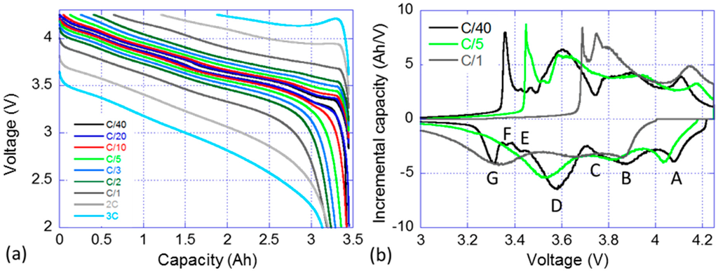 Nominal sample cell: (a) voltage vs. capacity curve; and (b) associated incremental capacity (IC) response in charge and discharge for selected rates (C/40, C/5 and C/1) (with the discussed features labeled from A to G).