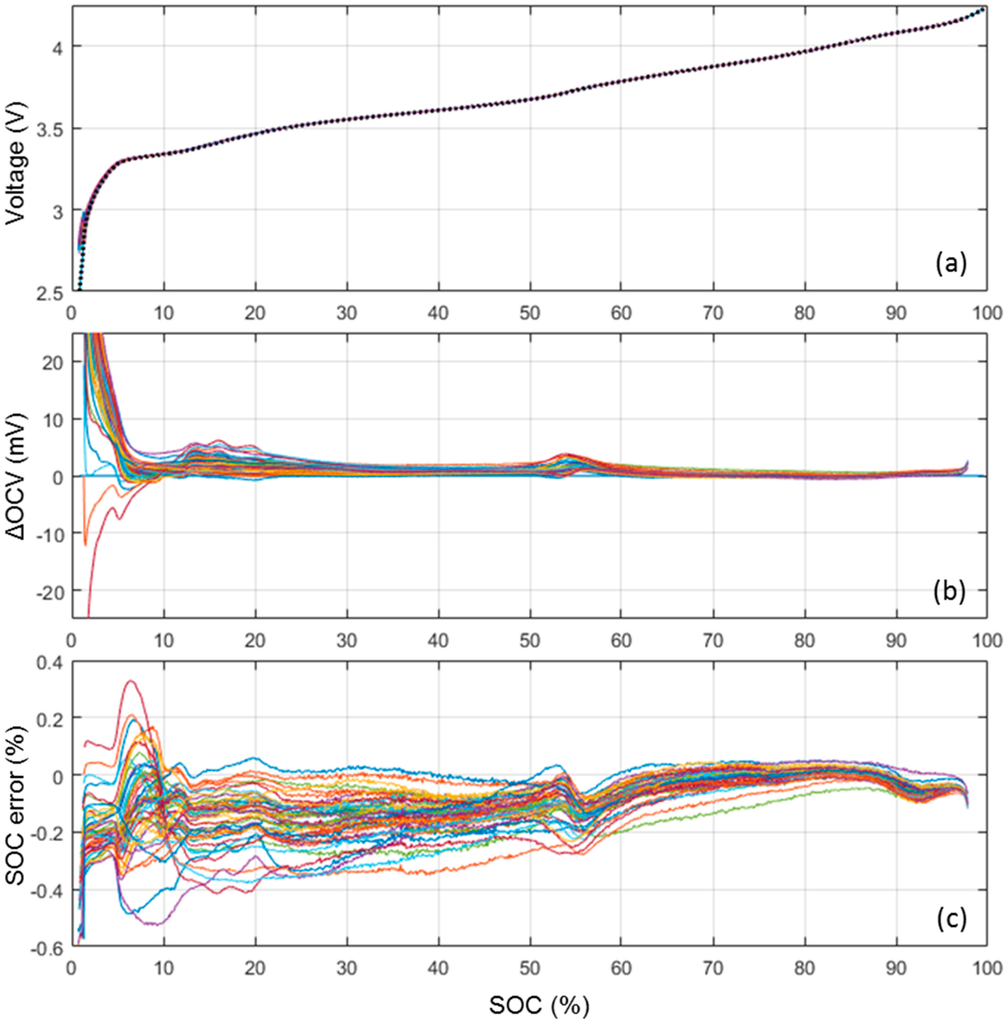 Figure 3a presents a comParison of the ps-OCV = f(SOC) curves calculated from the nominal sample cell (dotted line) C/40 cycle and from the 50 cells that experienced a C/35 cycle. At the scale of the voltage versus SOC curve, the 51 ps-OCV = f(SOC) curves are virtually undistinguishable. In order to enhance the differences between the curves, Figure 3b plots the voltage difference between the 50 ps-OCV = f(SOC) curves calculated from the C/35 cycles and the one calculated from the C/40 cycle. The voltage error is 1 mV or below for the most of the SOC range with some slight increase to at most 3 mV in the 60%–50% and 6 mV in the 20%–10% ranges and some more significant increase to more than 20 mV below 5% SOC. Those variations are likely induced by slightly different electrode loading and/or some inhomogeneities between cells in the initial solid electrolyte interphase (SEI) formation. Independent of their origin, these variations will induce some SOC estimation errors. In order to estimate the impact of these variations on the SOC estimation, the associated error was calculated, Figure 3c. The error was defined for each SOC as the SOC difference between the actual SOC and the SOC associated with the corresponding OCV plus the voltage variation. The average error was −0.01% with a 0.1% standard deviation and the maximum error was 0.5%. The ps-OCV = f(SOC) curve calculated form the C/40 cycle can thus be considered universal and representative of all the cells in the batch.