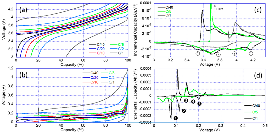 The results of the RPT for the PE and the negative electrode (NE) individually are shown in Figure 4. Figure 4a showcases the traditional voltage versus capacity curves highlighting the changes in electrochemical response with the increase of the current for the PE. The more current was passed through the cell, the less capacity was available and the more polarization was present. For example, at C/1, the PE only delivered approximately 60% of the low rate capacity and it presented a 400 mV higher polarization. Figure 4b presents the IC derivative of the data in Figure 4a. The IC signature of the PE is compatible with literature data on the NCA chemistry and four IC peaks labeled ①–④ can be observed. There were some kinetic limitations towards the end of the charge and the end of the discharge regimes. This induces a great asymmetry between the charge and discharge curves at low and high voltages. There was also an energy activation barrier to start the charging process (removing Li-ions from the structure), this explain the shape and the intensity of the low voltage peak ④ in charge. The same thing was observed in the full cell IC curve (Figure 2b, Feature G). Figure 4c,d presents the same plots for the NE. The IC signature of the NE is compatible with literature data on the graphite chemistry with five peaks noted ➊–➎ [43,44].