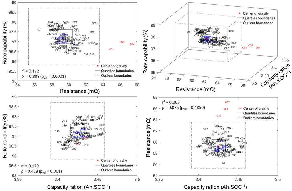 From Figure 5 above, a correlation analysis on the three attributes of cell-to-cell variations can be undertaken in order to determine if the attributes are correlated. There are several correlation coefficients, often denoted by the Greek letter ρ, measuring the degree of correlation and the most common is the Pearson correlation coefficient, which is sensitive only to linear relationships. To avoid this limitation, the Spearman’s rank correlation that is sensitive to any monotonic correlation was used in this work. The correlation coefficient is comprised between +1, in the case of a perfect direct (increasing) relationship, and −1 in the case of a perfect decreasing (inverse) relationship. The closer to zero, the more the variables are uncorrelated. Additionally, the p-values were calculated for each correlation. P-values were calculated to test the hypothesis of no correlation against the alternative that there is a nonzero correlation. If the p-value is small, e.g., less than 5%, then the correlation is significantly different from zero. The value of the correlation coefficient as well as the r2 and the associated p-values are reported on the top/side/front projections on Figure 5.