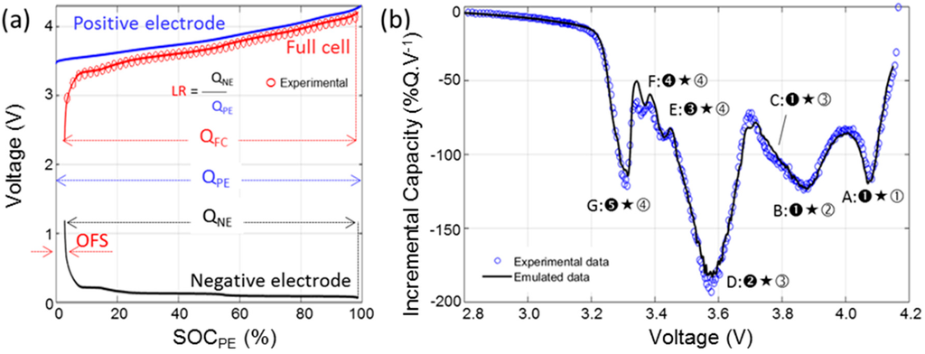 In order to address the second point, advanced diagnosis without the need for post mortem studies, the cell degradation mechanisms will be deciphered using computer assisted incremental capacity (IC) analysis and the detailed electrochemical signature of a Panasonic commercial graphite/LiNixCo1−x−yAlyO2 (NCA) cell will be investigated for the first time. IC is a non-destructive technique that was proposed by Balewski and Brenet for half cells in the late 1960s [29]. We pioneered its application to full cell degradation understanding in the late 2000s [30,31]. The computer assisted analysis was proposed in 2012 [32] and it relies on the assembly of an emulated replica of the full cell built from half-cell data harvested from both electrodes. This work will highlight the development of the emulated version and the visualization of the impact of degradation on the cell to be used later on for diagnosis.