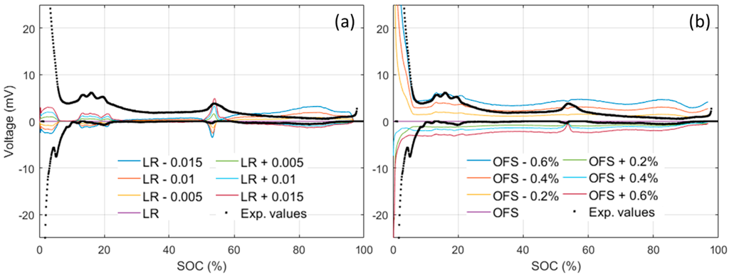 To estimate the OCV variations, simulations can be performed with various LR and OFS and the obtained OCVs can then be compared to the one obtained from Figure 6a. The evolution of the OCV difference in function of the SOC is presented in Figure 7. For small variations, the obtained curves resemble the one observed experimentally (Figure 3b). LR variations (Figure 7a), mostly affect the 10%–20%, 50%–60% and >65% SOC window, whereas OFS variations affect mostly the SOC below 10% with an almost constant background above. Comparing the observations from Figure 7 to Figure 3b, it appears that the experimental variations in the 10%–20% window, below 5% SOC, and the background were likely introduced by OFS variations of between ±0.2% and ±0.4%, whereas the variations in the 50%–60% SOC window were likely introduced by ±0.005 LR variations. The OFS is mainly influenced by loss of lithium inventory (LLI) [32] and the small observed variations were therefore likely introduced by different lithium consumption during the SEIs formation [43,44] that could also affect how much of the NE is going to be active and thus the LR. According to the values above, we can estimate that, within the 51 tested cells, there is a spread of at most 0.8% in the amount of Li-ion consumed during formation and of less than 1% in the loss of NE active material.