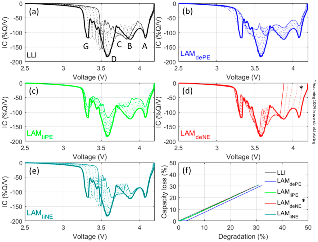 Each degradation mode exhibit a unique degradation signature, which will provide useful clues to identify degradation mechanisms in further studies using these cells. LLI (Figure 8a) results mainly in a shift of Feature G towards higher potentials, whereas Feature D is disappearing. LAMdePE (Figure 8b) results in the intensity decrease of all peaks and the disappearance of Feature G. LAMliPE (Figure 8c) also results in a decrease of intensity for all peaks but Features G and D are less affected. LAMdeNE (Figure 8d) results in the disappearance of Feature A and the shift of all the other peaks towards lower potential. The disappearance of Feature A opens the door for Li plating that is likely to occur concurrently to the LAMdeNE [32]. If part of the plating is reversible, a new peak will appear at higher potential. LAMliNE (Figure 8e) is characterized by a shift of peak G towards higher potentials whereas Feature D intensity is reduced. This signature is close to the one of LLI which is normal since LAMliNE can be dissociated into LLI + LAMdeNE. However, the signatures are different, as can be seen with Feature C, which is unaffected in the case of LLI but separated from Feature B in case of LAMliNE. Figure 8f presents the associated capacity losses. For the all degradation modes but LAMdePE, the capacity loss is directly proportional to the extent of the degradation mode. For LAMdePE there is slight delay for which the degradation is not inducing any capacity loss. This delay corresponds to the OFS, which can be seen as a lithium reserve for the PE [31,40].