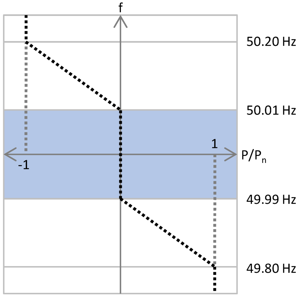 The PCR power that results from the P-f controller modified by all active DoFs is also provided in the permitted dead band within a frequency tolerance band of −10 mHz to +10 mHz when this DoF is activated.