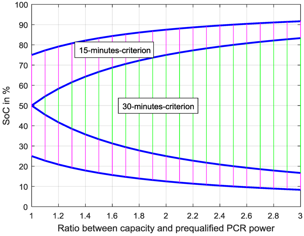 The control power demand indicated by the P-f characteristic must be provided within 30 s or less. Therefore, the gradient of the provided PCR power can be adjusted within certain boundaries in order to influence the charging or discharging speed as appropriate for the current SoC.