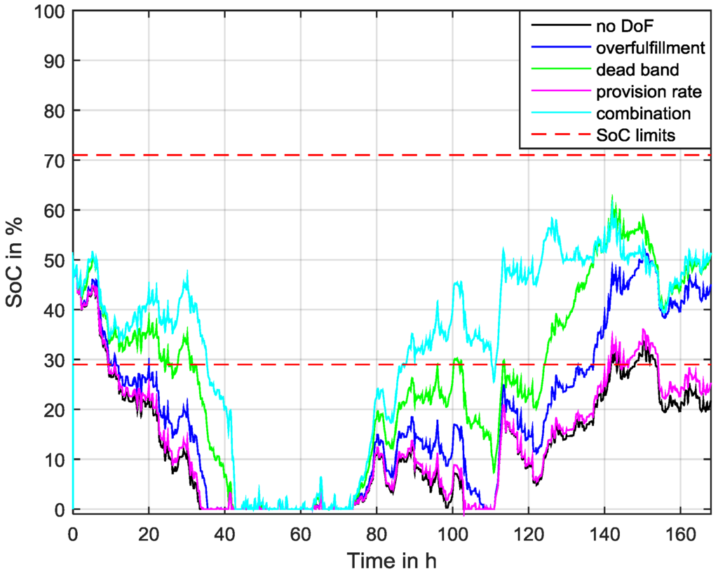 To correctly control every DoF, the PCR storage condition was divided into eight different states, which resulted in four cases that are explained in Table 2. Based on the present case, every DoF is either activated or deactivated to return the SoC to the value of SoCdes. The explicit strategy is to increase the PCR power provided by activating the DoFs overfulfillment and dead band. This strategy advanced the approach to the desired SoC (Cases 1 and 2) and/or delayed the demand progression of the PCR power by activating the DoF provision rate to keep the provided PCR power at the high level required to approach the SoCdes (Case 1) and to delay a further increase in the PCR power when this would result in a divergence from the SoCdes. A summary is given in Table 3. For a simple and efficient DoF implementation, every DoF provides its full potential when activated. The precise functionality of the DoFs is given in the sections below. The scheduled transactions that are part of the DoFs are controlled separately and explained further in Section 5.5.