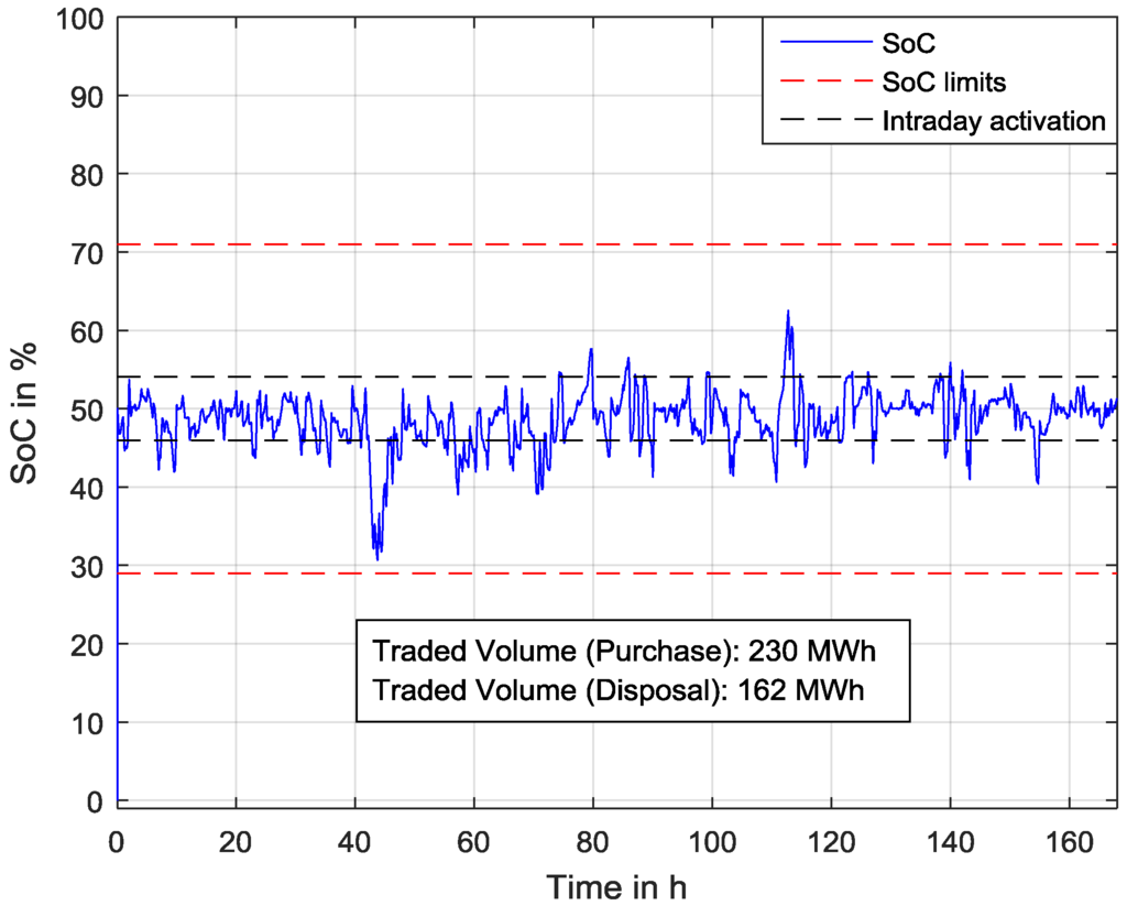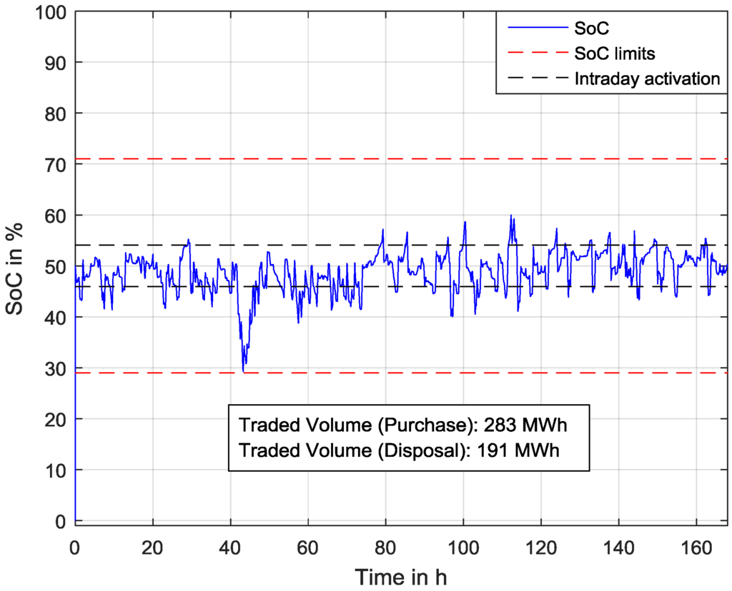 If the SoC exceeds the SoCmax,ID or falls below the SoCmin,ID, a balancing intraday trade must be activated to keep the SoC within the given boundaries. In accordance with [7], the minimum power, PID, to be traded amounts to 25% of the prequalified PCR power, Ppq, to counteract the maximum normal frequency deviation of 50 mHz.