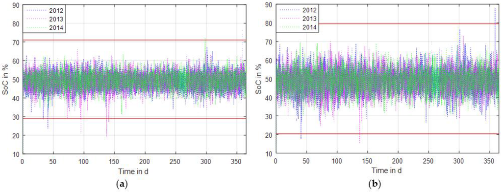 Figure 8 shows the SoC curves of the simulated battery storage systems over a full year for the grid frequencies from 2012, 2013 and 2014. The SoC limits were included, and the 30-min and 15-min criteria were considered. In every case, at least one SoC exceeds the limit values when the frequency departed from the normal progression given in Section 2.3. This SoC behavior is tolerated in accordance with [7], and the suggested parametrization of the PCR battery storage is, therefore, fit for use.