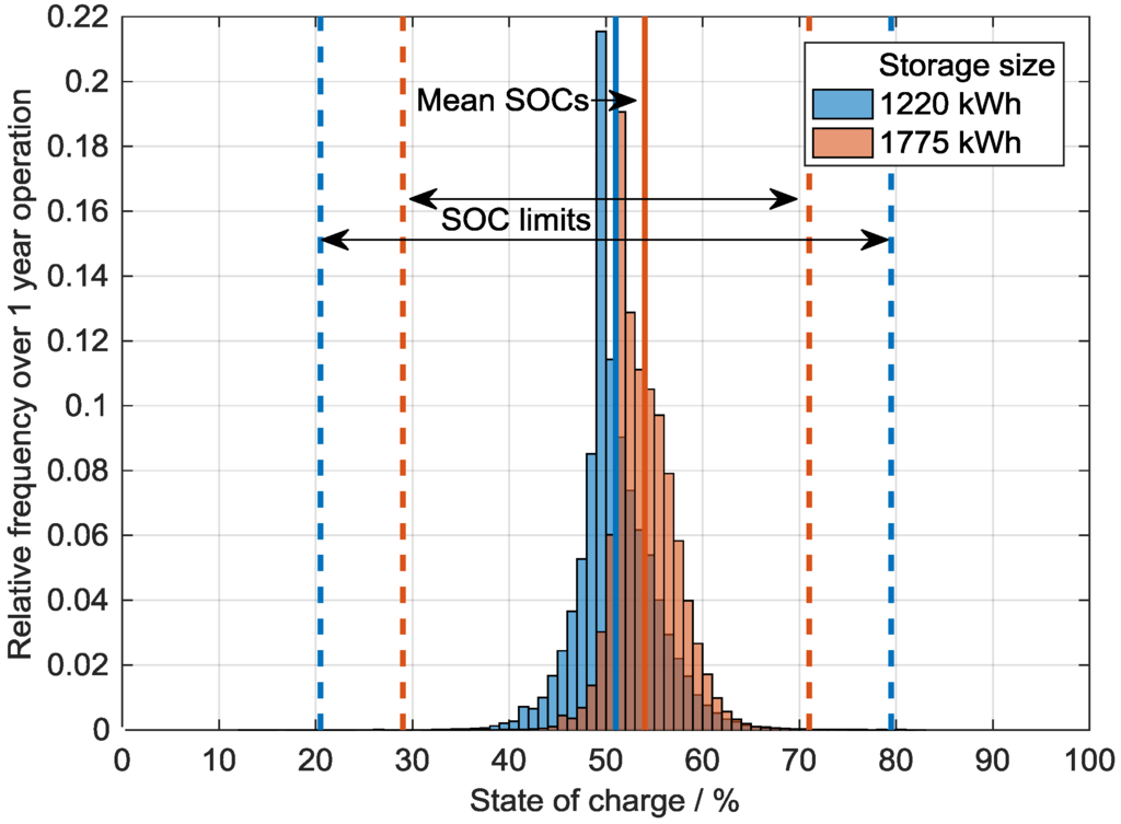 The characteristics of the SoC curves can be seen in more detail in Figure 9, where the probability distribution of the SoC is plotted for the two storage sizes according to the 15-min and 30-min criteria (1220 kWh, 1775 kWh) over one year of operation using the 2012 frequency data. The SoC shows an almost normal distribution at approximately 50% and remains in the region between 35% SoC and 65% SoC using the DoFs and scheduled transactions at the EPEX. The SoC probability distribution for the 1220 kWh storage is located approximately four SoC percentage points to the left of that for the larger storage size because of the larger possible operation range that assumes the 15-min criterion.