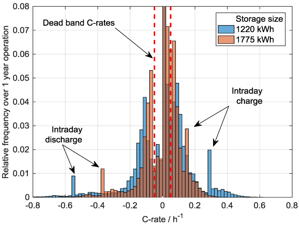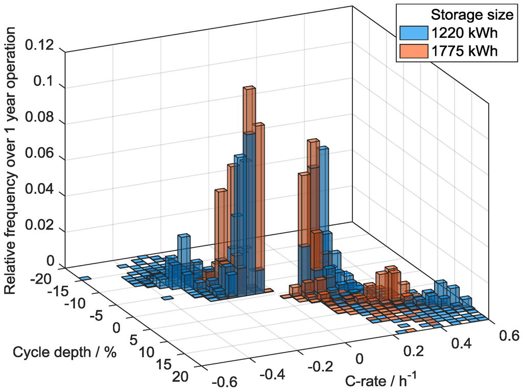 In Figure 10 and Figure 11, a closer look at the operating characteristics of the various storage sizes is possible. By detecting the half-cycles of the SoC curve, the cycle depths and C rates for each cycle were registered and are shown in the probability distribution data for one year’s operation using the 2012 frequency data. In the half-cycle, counting cycles with DoC < 1% are neglected; this results in the gap in the middle of the plot. Most of the cycles appear with |DoCs| < 5% and |C rates| < 0.2. In contrast, larger cycle depths appear with |C rates| > 0.2.