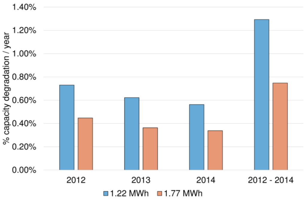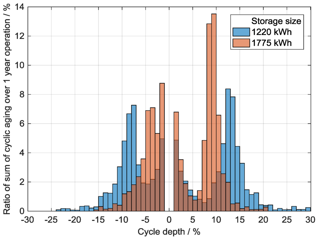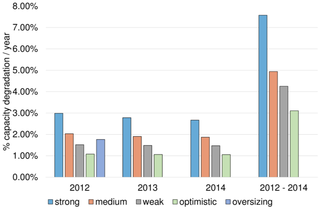 In addition, Figure 13 shows the effects of oversizing a storage system. In 2012, simulations were performed with a system oversized by a factor of 1.6, applying the same load used for all other systems. A decrease in aging from 3% to 1.8% was observed. Since the overall P/E ratio changed, the aging decrease does not correlate with only the BESS capacity. Therefore, an oversized system is not, in general, suitable for increasing the lifetime. A better cell quality, which is more expensive but has a higher lifetime expectancy, solves this problem.
