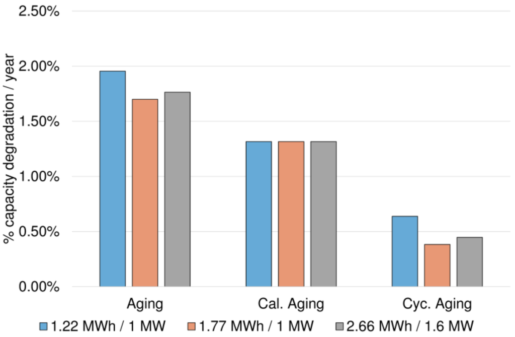 Whereas calendric aging shows no influence on the P/E ratio, cyclic aging has a different aging behavior. As described above, deeper cycles result in more extensive aging [11,15]. Hence, for the same power (1 MW), a larger BESS (1.77 MWh) has a decrease in aging compared to a smaller BESS (1.22 MWh) when the same load is applied. However, this relationship does not hold when the BESS power is adjusted non-linearly (1.6 MW) with the BESS capacity (2.66 MWh). An increase in aging is observed, and it is related to deeper cycles and higher C rates than the other setups.
