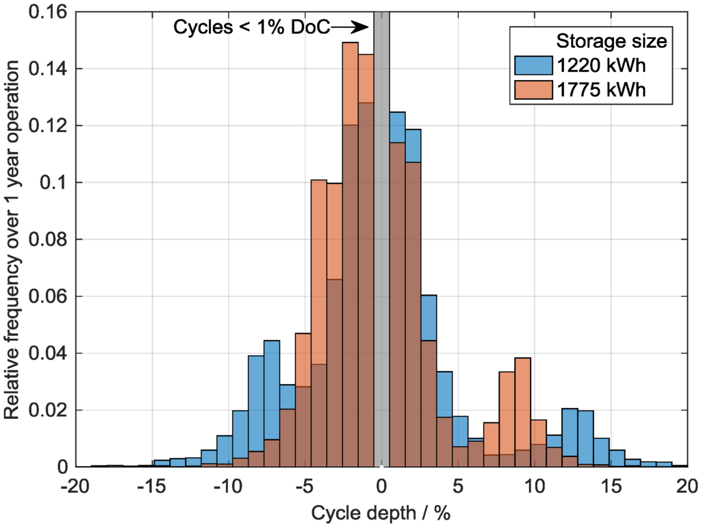 Figure 15 and Figure 16 allow a closer look at the aging characteristics for operation of the two storage system sizes, 1220 kWh and 1775 kWh, according to the 15-min and 30-min criteria. In Figure 15, the probability distribution of the cycle depths (DoC) is shown for one year of operation assuming the 2012 frequency data. Cycles with |DoCs| < 1% occur very often and are neglected in the probability distribution because of their insignificant impact on cyclic aging. We can see that cycles with |DoCs| < 15% in discharge and |DoCs| < 20% in the charge direction were most often detected. Comparing the two storage system sizes, we observed different peaks among the DoCs because of the different operation modes of the 15-min and 30-min criteria.