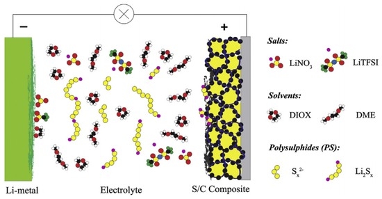 Schematic illustration of a typical lithium–sulphur (Li–S) cell [8]. Reproduced with permission from [8]. Copyright 2014, Elsevier. LiTFSI: lithium bis (trifluoromethylsulfonyl)imide; DIOX: dioxane; and DME: dimethoxyethane.