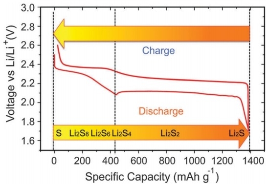 First of all, the insulating nature of sulphur (5 × 10−30 S·cm−1 at 25 °C) causes remarkably low utilization and poor rate capability [9,10,11]. Moreover, the polysulphides that are produced during cycling are further reduced to insulating Li2S2 and/or Li2S, which also significantly decreases the electrode kinetics and cycling capacities.
