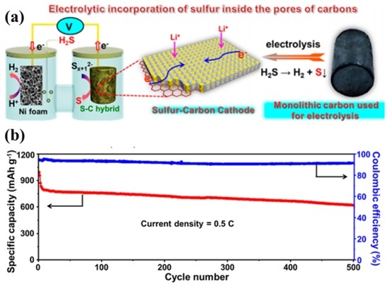 (a) Illustration of the electrolysis approach to the preparation of sulphur–carbon hybrids; and (b) long-term cyclability and Coulombic efficiency of monolithic carbon-2 (MLC-2) at 0.5C (1C = 1675 mA·g−1) [39]. Reproduced with permission from [39]. Copyright 2016, American Chemical Society.