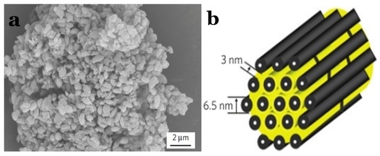 In 2009, breakthroughs were made regarding mesoporous C–S composite applications in Li–S batteries by Nazar’s group [50]. They reported CMK-3–S composites that displayed all of the benefits of confinement effects at a small length scale. The retaining conductive carbon framework at nanoscale dimensions afforded excellent accessibility of the active material. It not only acted as an electronic conduit to the active mass encapsulated within, but also served as a mini electrochemical reaction chamber. The entrapment ensured that a more complete redox process took place, and resulted in enhanced utilization of the active sulphur material. Figure 5a illustrates a scanning electron microscopy (SEM) image of CMK-3–S composite, and Figure 5b reveals a schematic diagram of the sulphur (yellow) confined in the interconnected pore structure of mesoporous carbon. From then on, a number of works reported the CMK-3 and CMK-3-based carbon composite as the sulphur host for Li–S batteries [51,52,53,54,55,56,57].