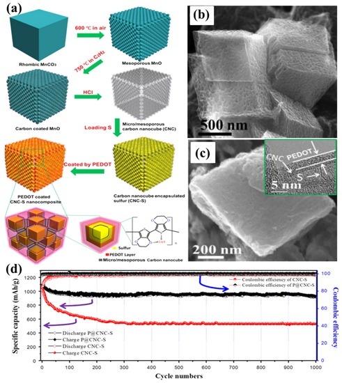 (a) A schematic illustration for preparing poly(3,4-ethylenedioxythiophene) (PEDOT)-coated multi-chambered micro/mesoporous carbon nanocube–sulphur composites (P@CNC–S); (b) SEM image of micro/mesoporous carbon nanocubes; (c) SEM image of P@CNC–S composites with inset high-resolution transmission electron microscopy (HRTEM) image of the details of P@CNC–S composites; (d) cycling performance of P@CNC–S and CNC–S composites at 0.5C and the corresponding Coulombic efficiencies [86]. Reproduced with permission from [86]. Copyright 2015, Elsevier.