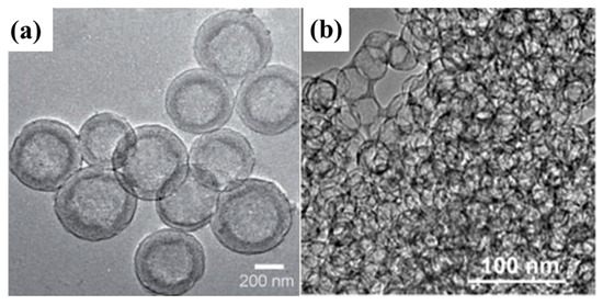 (a) Transmission electron microscopy (TEM) images of mesoporous carbon hollow spheres [90]. Reproduced with permission from [90], Copyright 2012, Wiley-VCH. (b) Peapod-like mesoporous carbon [93]. Reproduced with permission from [93]. Copyright 2013, American Chemical Society.