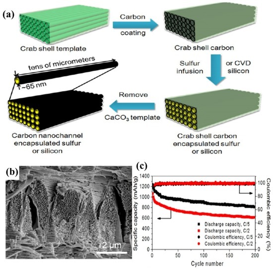 (a) Schematic illustration of the fabrication procedure for hollow CNF arrays encapsulating sulphur or silicon electrode materials based on stone crab shell templates; (b) SEM image of crab shell; and (c) capacity and Coulombic efficiency at C/5 and C/2 vs. cycle number [96]. Reproduced with permission from [96]. Copyright 2013, American Chemical Society. CVD: chemical vapor deposition.