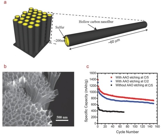 Initially, carbon nanofiber (CNF) was used as an additive in the sulphur electrode in order to improve cycling properties [106,107]. In 2011, Elazari et al. [108] synthesized CNF–S composites by impregnating microporous activated carbon fibers with elemental melted sulphur, and Ji et al. [109] encapsulated sulphur in porous CNFs via electrospinning, carbonization, and solution-based chemical reaction–deposition method. The CNF–S composites prepared by two distinctive methods as cathodes for Li–S batteries were both evaluated, and demonstrated good electrochemical performances. Both of them attributed the good electrochemical performance to the high electrical conductivity and the extremely high surface area of the CNFs that homogeneously disperse and immobilize S on their porous structures, alleviating the polysulphide shuttle phenomenon. Following this line of research, Cui’s group [110] used anodic aluminum oxide (AAO) as the template to synthesize hollow CNFs with a high aspect ratio. Sulphur was then loaded into the hollow CNFs by mixing and heating to 155 °C. The schematic diagram of the high aspect ratio 1D hollow CNF–S composite is shown in Figure 9a. The presence of the AAO membrane prevents the coating of sulphur onto the outer walls of the CNFs, thus reducing the exposure of sulphur to the electrolyte (Figure 9b). Electrochemical testing showed that this sulphur cathode delivered a high initial discharge capacity of around 1400 mA·h·g−1 with around 75% sulphur loading in the electrode and 1 mg·cm−2 of sulphur content. The cycling capacity retention also showed significant improvement, with a reversible capacity of around 730 mA·h·g−1 after 150 cycles of charge–discharge (Figure 9c). Recently, they found that, by introducing amphiphilic polymers to modify the CNF surface that renders strong interactions between the nonpolar carbon and the polar LixS clusters, the capacity fading mechanism can be reduced further [111]. The modified sulphur cathode showed excellent cycling performance with specific capacity close to 1180 mA·h·g−1 at C/5 current rate. Capacity retention of 80% was achieved over 300 cycles at C/2.