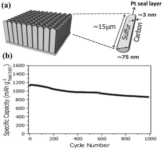 (a) A schematic of each CNTs–S with the dimensions of the key components denoted; and (b) cycling performance of the CNTs–S electrode with a discharge rate of 5C and a charge rate of 2C for 1000 cycles [126]. Reproduced with permission from [126]. Copyright 2013, WILEY-VCH.