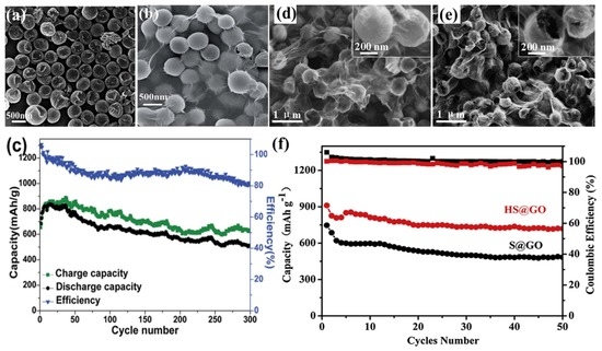 SEM images of (a) sulphur particles; (b) graphene oxide (GO)-wrapped bowl-like sulphur composite; and (c) Cycling performance at rates of 0.2 A·g−1 [146]; reproduced with permission from [146]. Copyright 2015, Royal Society of Chemistry. Field emission SEM (FESEM) images of (d) GO-coated solid and (e) hollow sulphur particles, the insert at the right-top corners are their magnification; (f) cycle performances and corresponding Coulombic efficiencies of sulphur@graphene oxide (S@GO) and hollow S@GO (HS@GO) electrodes at 0.2C [147]. Reproduced with permission from [147]. Copyright 2015, Elsevier.