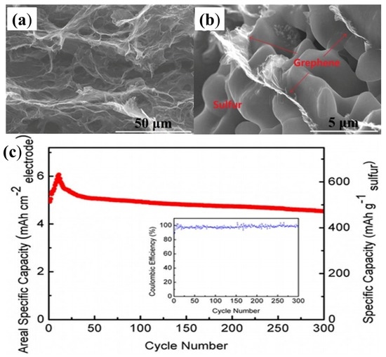 As early as 2011, researchers began using the hydrothermal method to reduce GO to RGO, in order to be mixed with sulphur to fabricate RGO–S composites [148]. However, the sulphur content is only 17.6% across whole electrode, which fails to meet the demands of the industry. Later, Dong’s group [149] also used the hydrothermal method to reduce GO, but the team managed to increase the sulphur content to 60.16%. This RGO–S hybrid showed a large reversible capacity of 773 mA·h·g−1 and 662 mA·h·g−1 after 100 cycles at 0.5C and 1C, respectively. It is known that the hydrothermal method is a simple and effective strategy to form the 3D structures; thus, a variety of 3D-RGO–S composites have been synthesised by this hydrothermal reduction method [150,151,152,153], and the as-prepared RGO–S illustrated excellent electrochemical performance. For example, when the RGO sponges underwent melt-diffusion with the sulphur, they retained the 3D structures (as shown in Figure 12a,b) [151]. Due to this unique 3D structure, it showed a reversible and comparable capacity of 4.53 mA·h·cm−2 after 300 cycles (Figure 12c), corresponding to capacity retention of 75.5% (of its highest capacity of 6.0 mA·h·cm−2), resulting in a decay rate as low as 0.08% per cycle for 300 cycles.