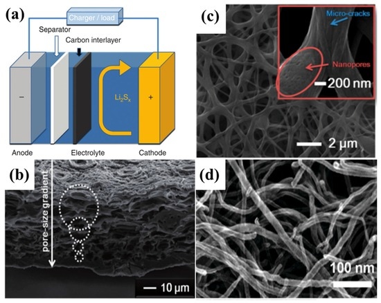 - Zu, C.; Su, Y.S.; Fu, Y.; Manthiram, A. Improved lithium–sulfur cells with a treated carbon paper interlayer. Phys. Chem. Chem. Phys. 2013, 15, 2291–2297. [Google Scholar] [CrossRef] [PubMed]