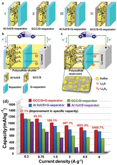 - Zhou, G.; Pei, S.; Li, L.; Wang, D.W.; Wang, S.; Huang, K.; Yin, L.C.; Li, F.; Cheng, H.M. A graphene–pure-sulfur sandwich structure for ultrafast, long-life lithium–sulfur batteries. Adv. Mater. 2014, 26, 625–631. [Google Scholar] [CrossRef] [PubMed]