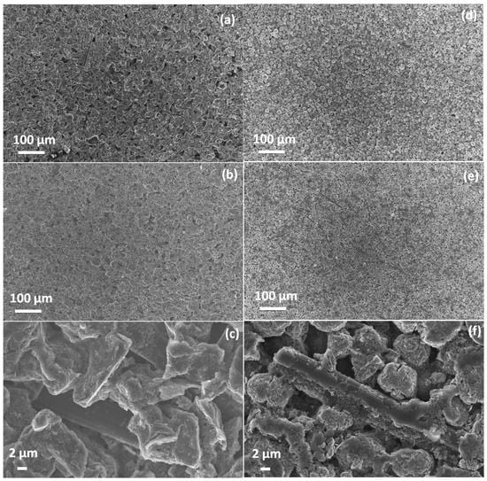 Scanning electron microscope (SEM) images of the thick electrodes. (left) Graphite anode: (a) as-coated (350 m, porosity 58%); (b) calendered (280 m, porosity 48%); and (c) high magnification (280 m, porosity 48%). (right) Lithium nickel manganese cobalt oxide (NMC) cathode: (d) as-coated (300 m, porosity 44%); (e) calendered (250 m, porosity 38%); and (f) high magnification (250 m, porosity 38%).