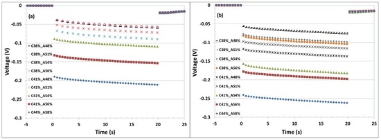 To achieve the optimum utilization and electrochemical performance of the active material in the thick electrodes, the appropriate porosity should be selected. To understand the effect of the porosity, the full cells were stopped at 3.7 V and paused for 30 min, before a discharge current pulse at C/2 rate for 20 s was applied. Figure 2 shows the corresponding voltage profiles, which were recorded directly after formation (Figure 2a) and after 90 cycles (Figure 2b). The full cell Cell A (C44%-A58%) with as-coated electrodes showed the largest voltage drop (205 mV, after formation cycles) in comparison to the other cells. This indicates that the cell would reach the cut-off voltages faster, and therefore, the whole active material cannot be utilized. It was observed that the voltage drop is decreased as the porosity decreases [6]. The cells with porosity of 38% on the cathode side showed the minimum voltage drop (∼56 mV) after the formation cycles.